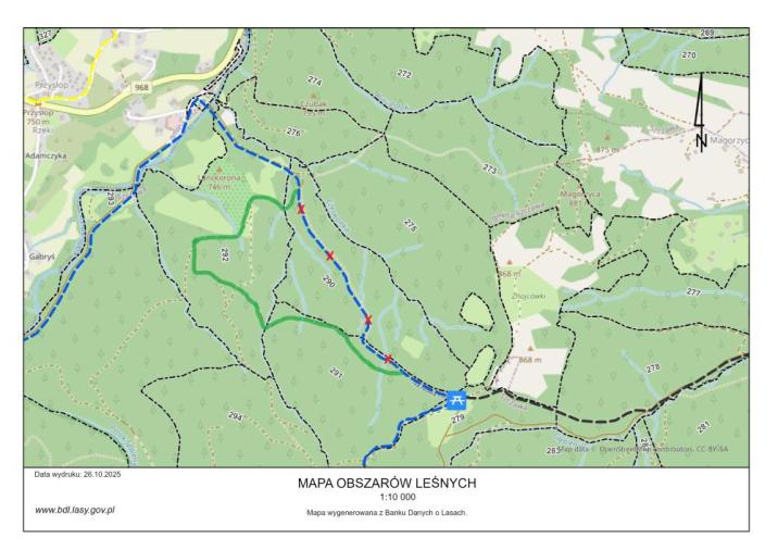 Osoby znajdujące się w pobliżu oddziału 290 prosimy o zachowanie szczególnej ostrożności i stosowanie się do oznakowania umieszczonego na terenie leśnym, a także o wyrozumiałość. Nadleśnictwo dokłada starań, aby prace przeprowadzone były w sposób jak najszybszy oraz najmniej uciążliwy dla turystów.